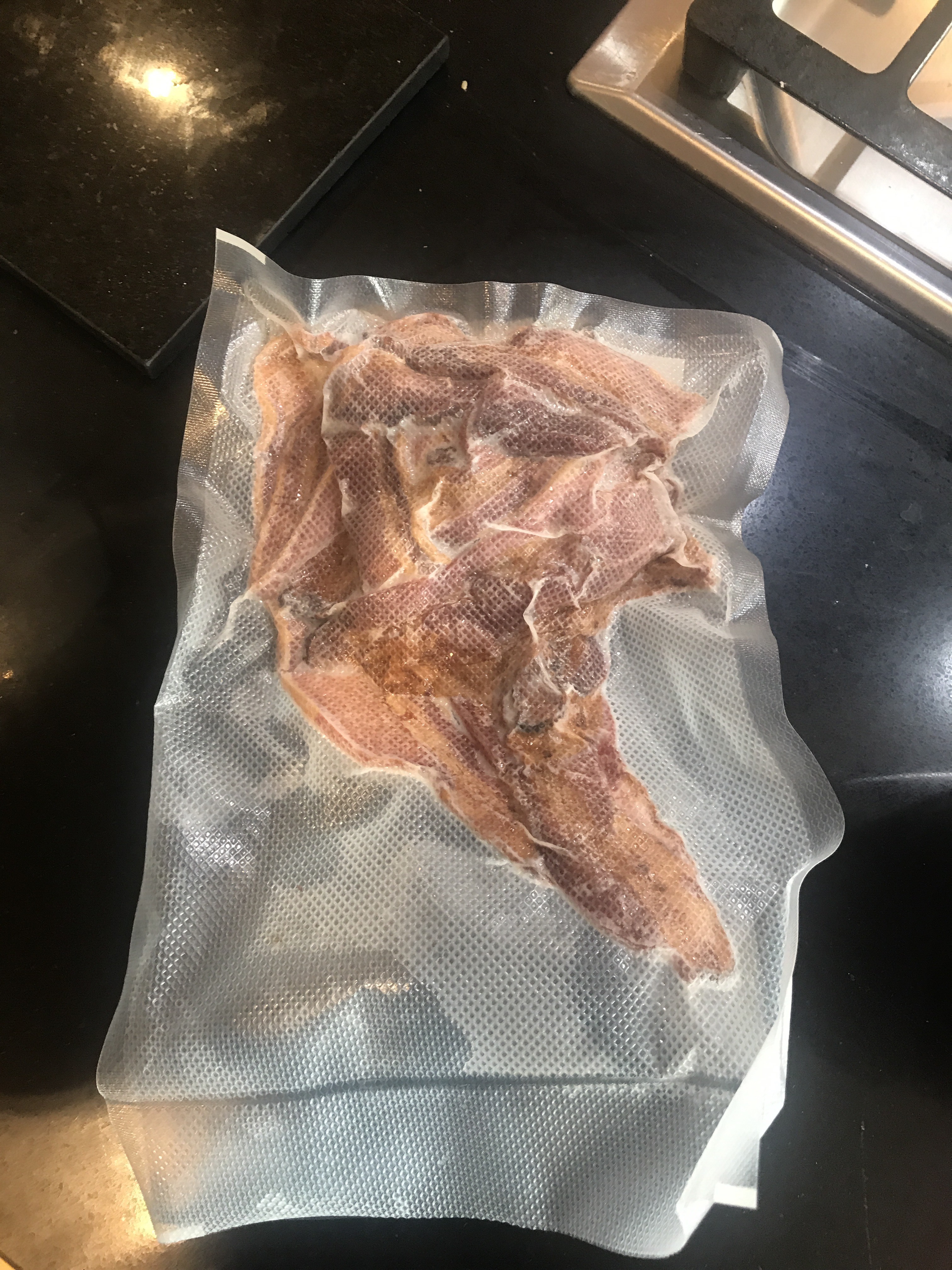 Now to prepare the bacon for camping. We have a vacuum packer and I love it. I’m looking into ways to use reusable silicone bags with my sealer but till then I’ll use the plastic. I put a family size serving of bacon in the bag and seal ‘er up. If possible I try really hard to make the bacon lay flat. I do this for two reasons: 1) flat bacon defrosts easier and 2) stores easier. I then freeze my deliciousness for future use. It’s also pretty easy to do this with a ziplock bag it’s just harder to get all the air out. I can’t tell you how long that bacon will last in the fridge because it never makes it past a month. To use it… open the bag and reheat bacon in a pan. Now have happy belly num num num.