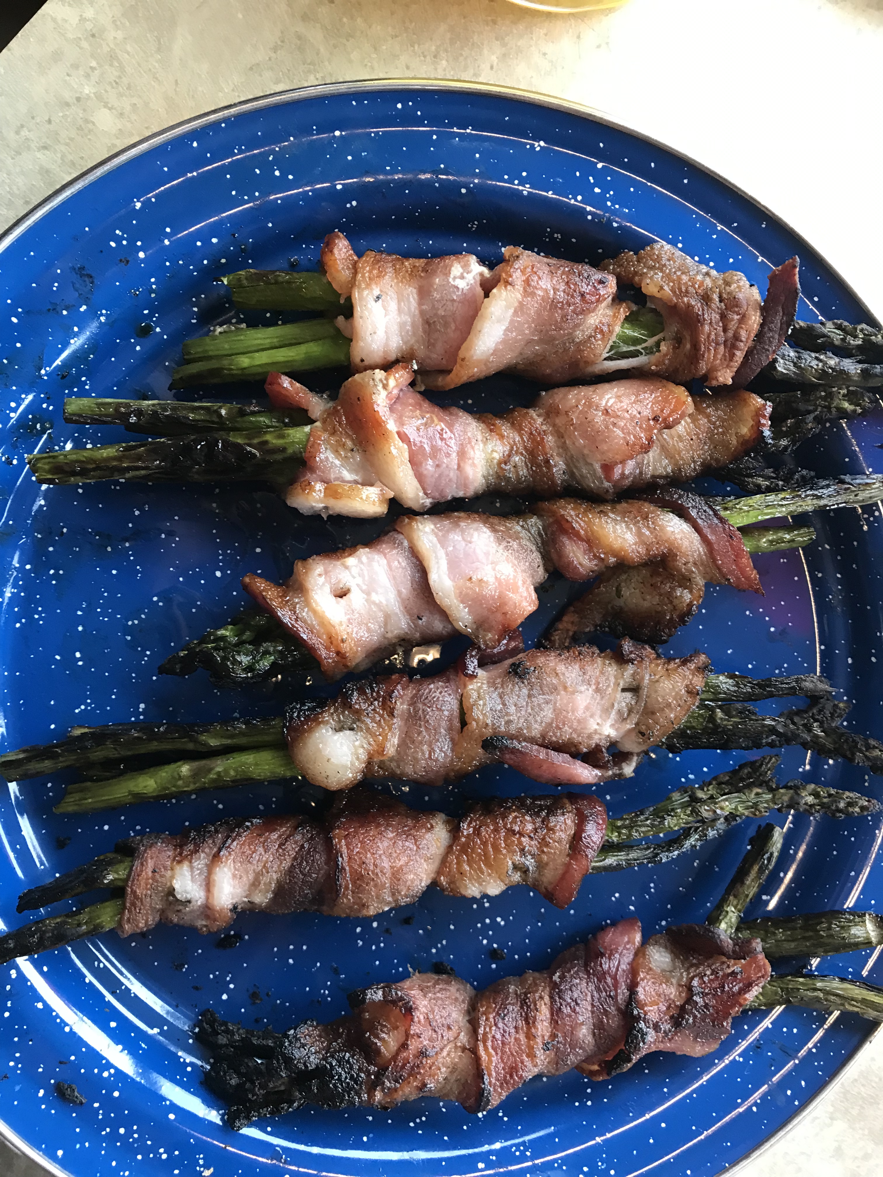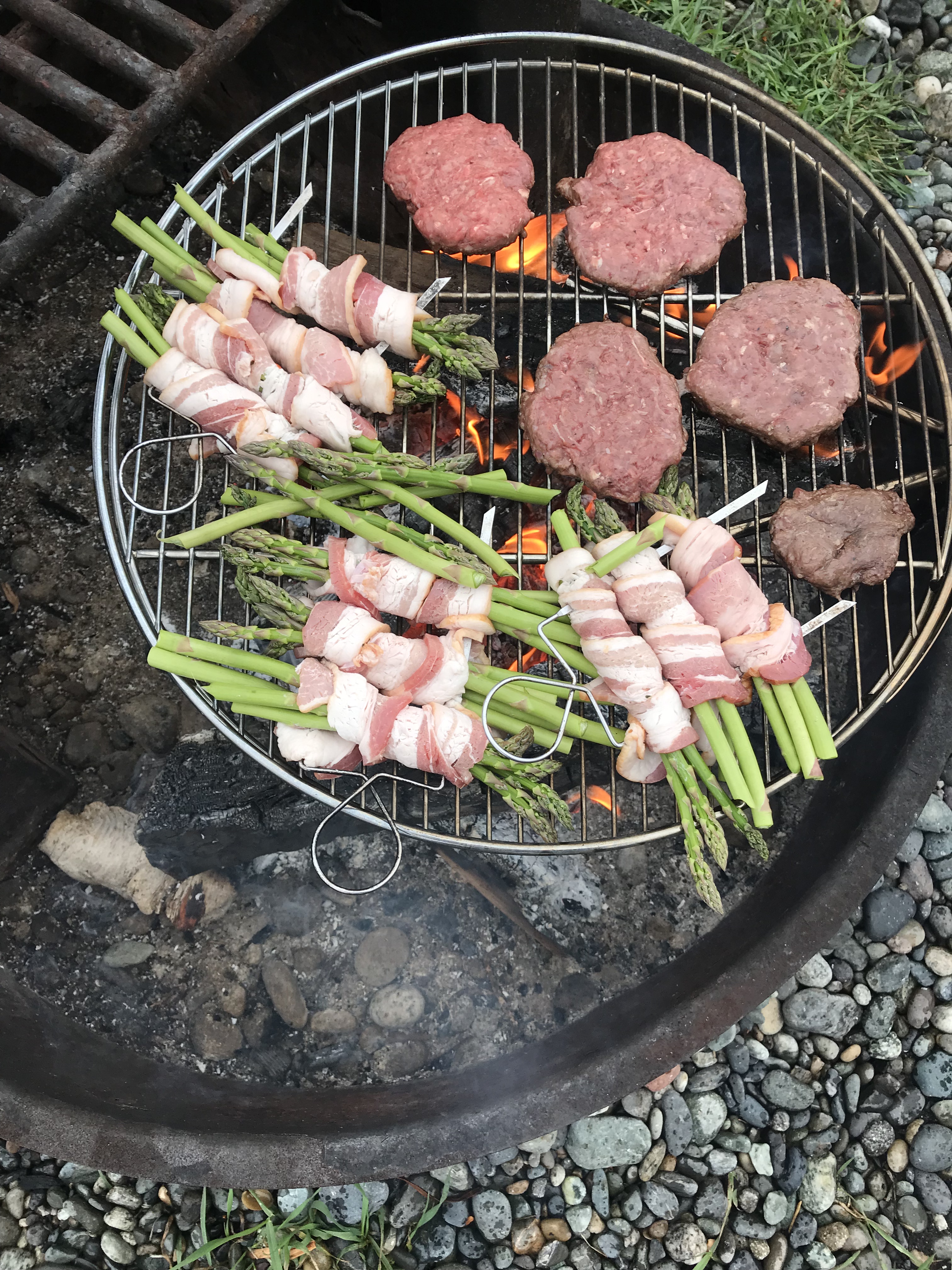 - If you like asparagus try this option. Even if you don’t like asparagus try it. Because we shall now wrap asparagus IN BACON. Yeah I just took a perfectly healthy veggie and added bacon to it and I regret this decision not at all. We love our asparagus this way and hopefully you will too. Grab a couple of spears of asparagus, wrap it in the tasty deliciousness known as bacon and spear that stuff onto a .. yep a metal skewer. Now cook it over a fire. You’ll have to turn them or things will burn but it’s so good. The bacon grease and flavor permeate the asparagus and it’s really a lovely combination.